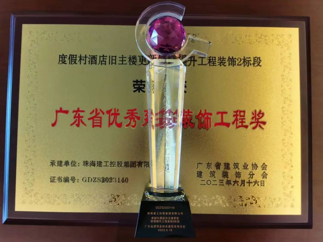度假村酒店舊主樓更新修繕提升工程裝飾2標(biāo)段榮獲全國建筑工程裝飾獎、廣東省優(yōu)秀建筑裝飾工程獎、珠海市優(yōu)秀建筑裝飾工程獎。