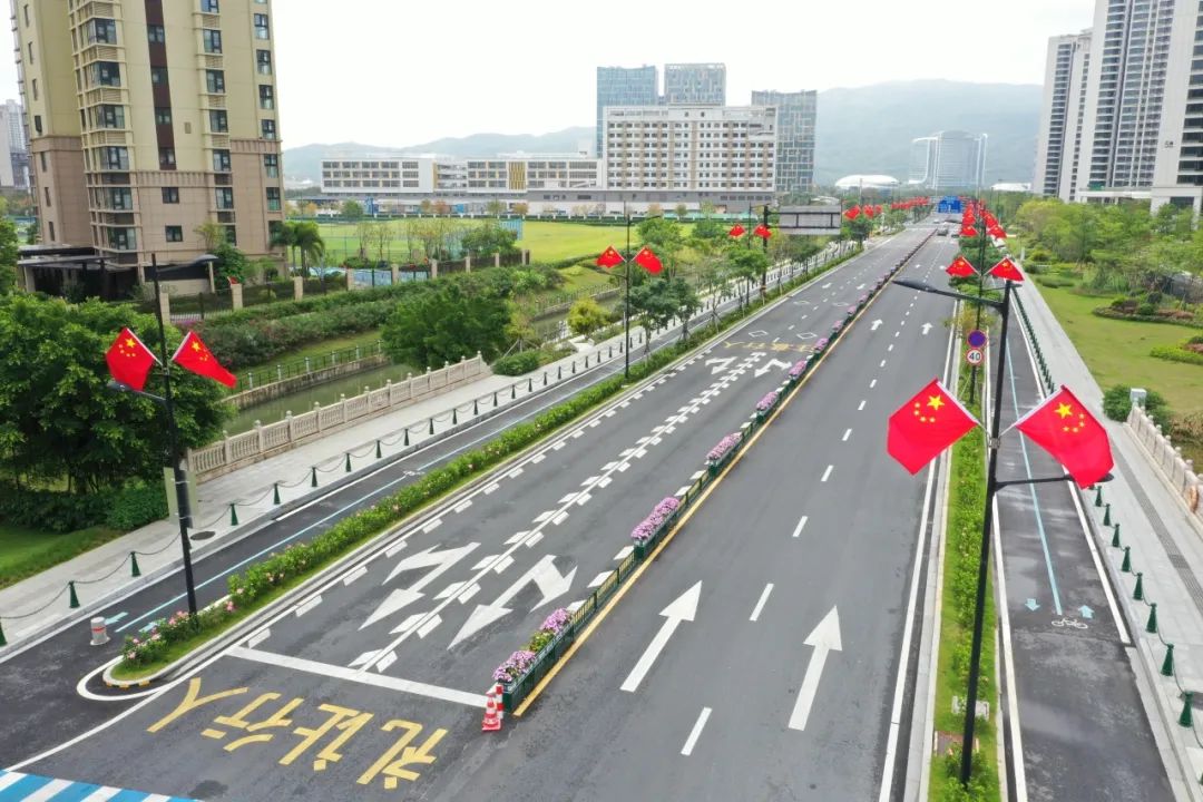 鮮艷的五星紅旗迎風(fēng)招展,與藍(lán)天白云相映成輝,為道路注入莊嚴(yán)喜慶、歡樂(lè)祥和的節(jié)慶氣息。