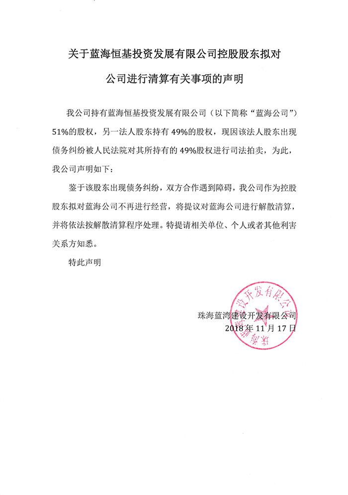 關(guān)于藍海恒基投資發(fā)展有限公司控股股東擬對公司進行清算有關(guān)事項的聲明